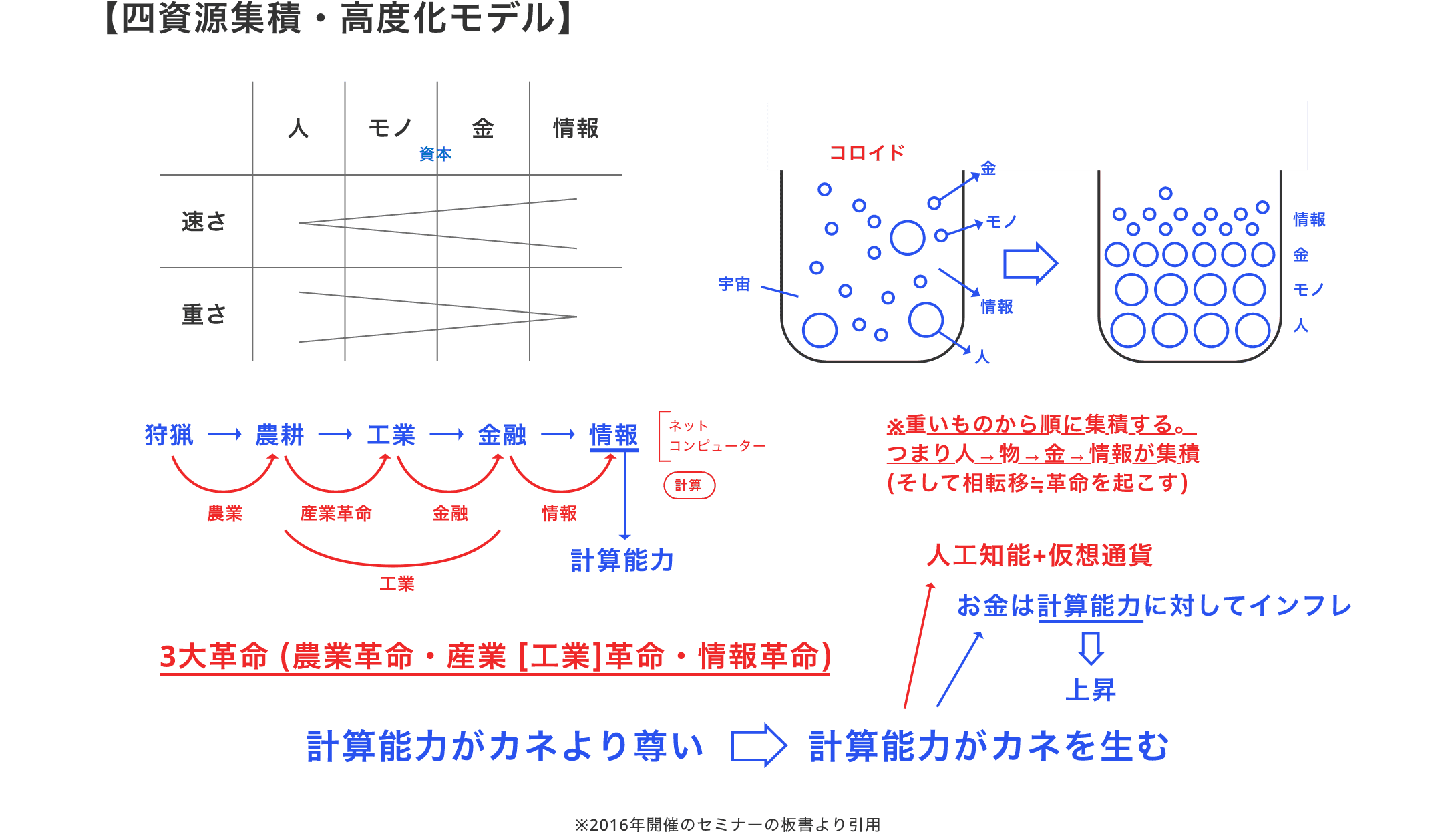 金<情報処理(AIの所有、もっと言うと計算能力の所有によって、金が生み出される状態。逆を返せば、金は減価=インフレを続け、AIがそれを手動し、計算能力の所有こそが金を生み出す手段になる新しいパラダイム)
